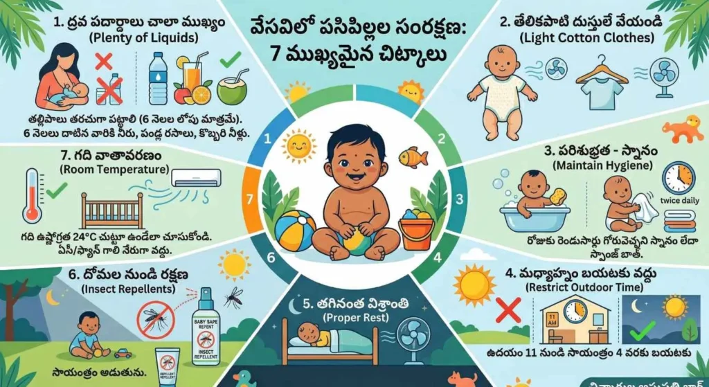 ఎండల తీవ్రత చూసి కంగారు పడకండి. పిల్లలను ఎప్పుడూ చల్లగా ఉండేలా చూసుకోవడం, వదులైన కాటన్ దుస్తులు వేయడం, పరిశుభ్రత పాటించడం మరియు తగినన్ని ద్రవ పదార్థాలు (ముఖ్యంగా 6 నెలల లోపు పిల్లలకు కేవలం తల్లిపాలు) అందిస్తే చాలు… మీ చిన్నారి ఈ వేసవిని చాలా ప్రశాంతంగా, హ్యాపీగా గడిపేస్తుంది.